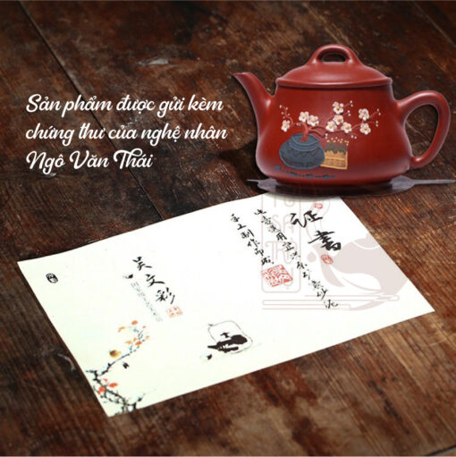 – Ấm tử sa Nhàn Thích Mai Hoa Đại hồng bào là tác phẩm của nghệ nhân Ngô Văn Thái (nghệ nhân cấp Quốc gia). Ấm có 4 dấu triện được khắc ở tay cầm, nắp ấm, mặt trong ấm và dưới đáy. Gửi kèm theo ấm còn có chứng thư của tác giả.