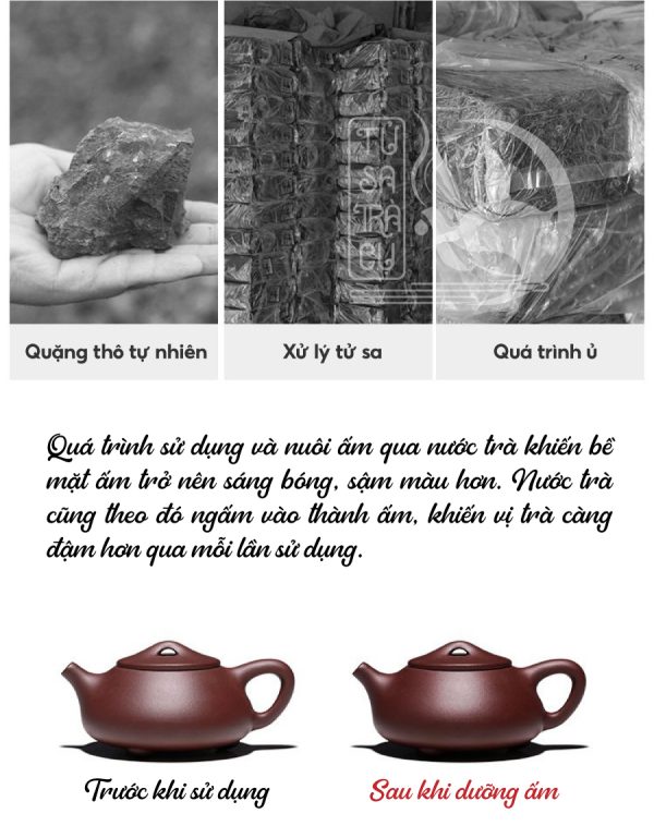 – Quá trình sử dụng và nuôi ấm tử sa Cảnh Châu Thạch Biều qua nước trà khiến bề mặt ấm trở nên sáng bóng, sậm màu hơn. Nước trà cũng theo đó ngấm vào thành ấm, khiến vị trà càng đậm hơn qua mỗi lần sử dụng.