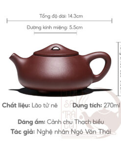 – Ấm được làm theo dáng Thạch Biều Cảnh Chu kinh điển, với cấu trúc phần trên nhỏ và phần dưới thoải dần, tổng thể giống một chiếc kim tự tháp. Trọng tâm ấm cân đối và ổn định với sự đối xứng hai bên hoàn hảo, miệng ấm ngắn, thẳng tạo nên sự mạnh mẽ, quai ấm gần giống hình tam giác phần vòi ấm khá ngắn nên dòng nước chạy ra rất mạnh nhưng lại không hề làm bắn giọt li ti.