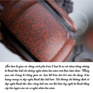 – Ấm làm từ giao nê, bằng cách pha trộn 2 loại tử sa với nhau bằng những kĩ thuật đặc biệt chỉ những nghệ nhân lâu năm mới thực hiện được. Thông qua việc trang trí bằng giao nê, họa tiết trên ấm trở nên đa dạng, trừu tượng mang vẻ đẹp nghệ thuật đặc biệt hơn. Nó không chỉ khẳng định vẻ đẹp nghệ thuật độc đáo riêng biệt mà còn thể hiện tay nghề kĩ thuật đẳng cấp lão luyện của các vị nghệ nhân lâu năm.