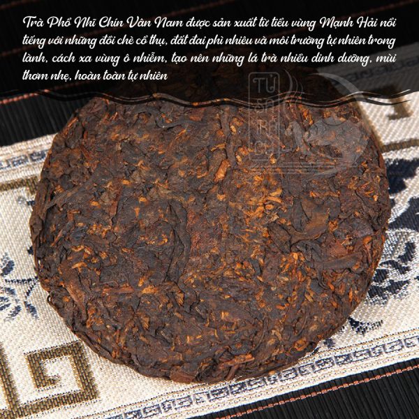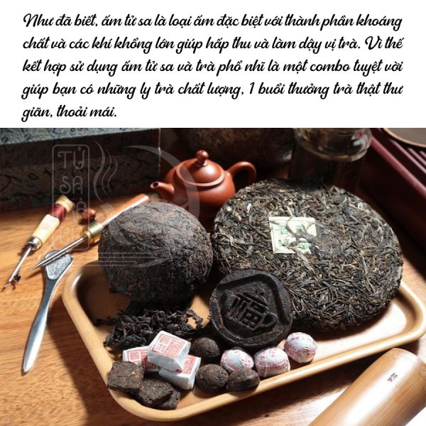 – Trà Phổ Nhĩ Chín Vân Nam được sản xuất từ tiểu vùng Mạnh Hải nổi tiếng với những đồi chè cổ thụ, đất đai phì nhiêu và môi trường tự nhiên trong lành, cách xa vùng ô nhiễm, tạo nên những lá trà nhiều dinh dưỡng, mùi thơm nhẹ, hoàn toàn tự nhiên. Như đã biết, ấm tử sa là loại ấm đặc biệt với thành phần khoáng chất và các khí khổng lớn giúp hấp thu và làm dậy vị trà. Vì thế kết hợp sử dụng ấm tử sa và trà phổ nhĩ là một combo tuyệt vời giúp bạn có những ly trà chất lượng, 1 buổi thưởng trà thật thư giãn, thoải mái. Lá trà nâu đỏ, mềm, nhiều tinh dầu ẩm bóng, là loại trà cổ hiếm hoi có khả năng chống tạo bọt với đầy đủ màu sắc, hương vị hoàn chỉnh. Màu trà nâu đỏ đậm đà, trong suốt như ngọc thể hiện rõ sản phẩm lá trà chất lượng cao, được ủ men kĩ hoàn toàn. Hương vị trà thơm dịu dàng, hậu vị dai dẳng, sau khi uống vẫn cảm thấy hương nhẹ nhàng vấn vít.